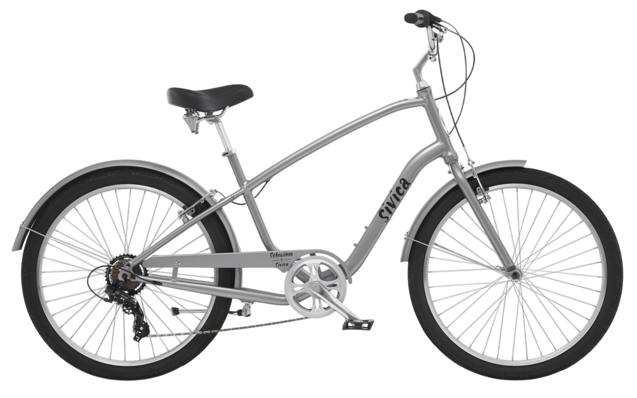 Sivica 7 - это комфортный семискоростной велосипед с неповторимым стилем. Увеличенная колёсная база и вынесенная вперёд каретка новой рамы Schwinn Relaxed Position Plus создаёт очень комфортную посадку и дарит стабильность при катании на небольших скоростях. Широкое комфортное седло, регулируемое по наклону, и регулируемый по высоте руль помогают подобрать посадку индивидуально для Вас. Семи скоростная трансмиссия Shimano Tourney управляется переключателями типа Грипшифт на руле, плавно и чётко меняет передачи и не требует частого обслуживания. Полноразмерные крылья и защита цепи предохраняют одежду от загрязнения и позволяют кататься в любую погоду.